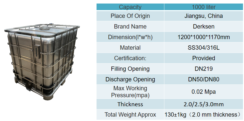 Этот резервуар из нержавеющей стали изготовлен из нержавеющей стали 304/316L, включая поддон и каркас. Процесс сварки — TIG-сварка. Объемом 1000 литров, он специально разработан для безопасного хранения и транспортировки жидких или гранулированных материалов. Донный поддон сварен из квадратной нержавеющей трубы размером 40×40, что позволяет стекать, вращаться и повторно использоваться.