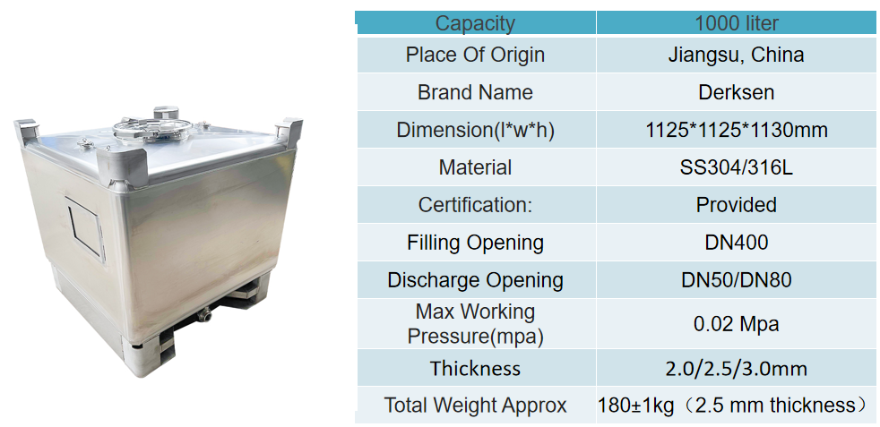 This stainless steel tank is made of 304/ 316L stainless steel including the pallet and the frame .The welding process is TIG welding. With a capacity of 1000 litres, it is specially designed for the safe storage and transportation of liquid or granular materials.The bottom pallet is welded with 40×40 stainless steel square tube, which can be stacked, revolved and reused.